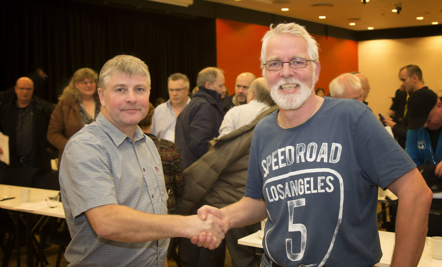 Afdelingsformand Flemming Hansen, Fødevareforbundet NNF Østjylland (tv) lykønsker afdelingsformand Kjeld Nielsen, Fødevareforbundet NNF Horsens-Vejle, der blev valgt til formand for den nye afdeling.(Foto: Henrik Bjerg)