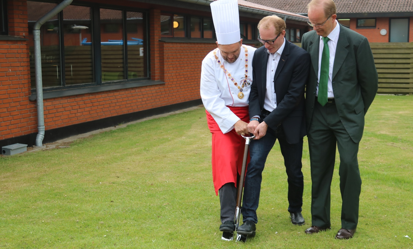 Ved fælles hjælp tog oldermand i Københavns Konditorlaug, John Jønsson, Ringsteds borgmester, Henrik Hvidesten, og bestyrelsesformand i ZBC [Zealand Business College], Vagn Sanggaard Jakobsen, det første spadestik til ZBC's nye kondistorskole i Ringsted.