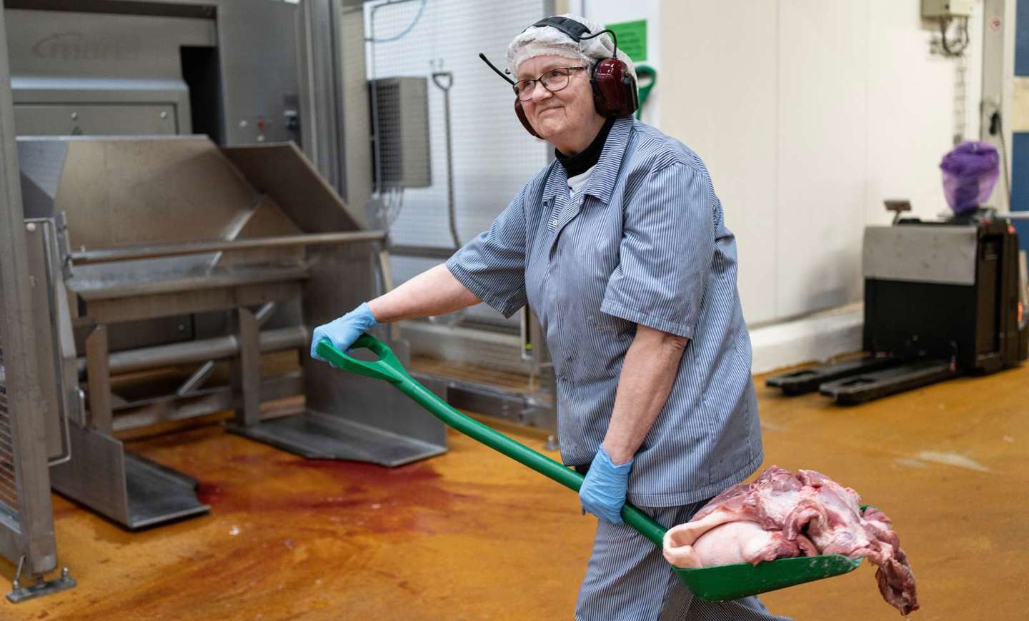 Kødstykker bliver fejet hurtigt sammen. Den lille bunke holdes på plads med støvlen, så skovlen kan komme ind under, og kødet læses op i et trug i et snuptag. Lisbeth Christensen springer op på trucken og kører videre til næste station, hvor mere kødaffald fejes op i et energisk tempo.