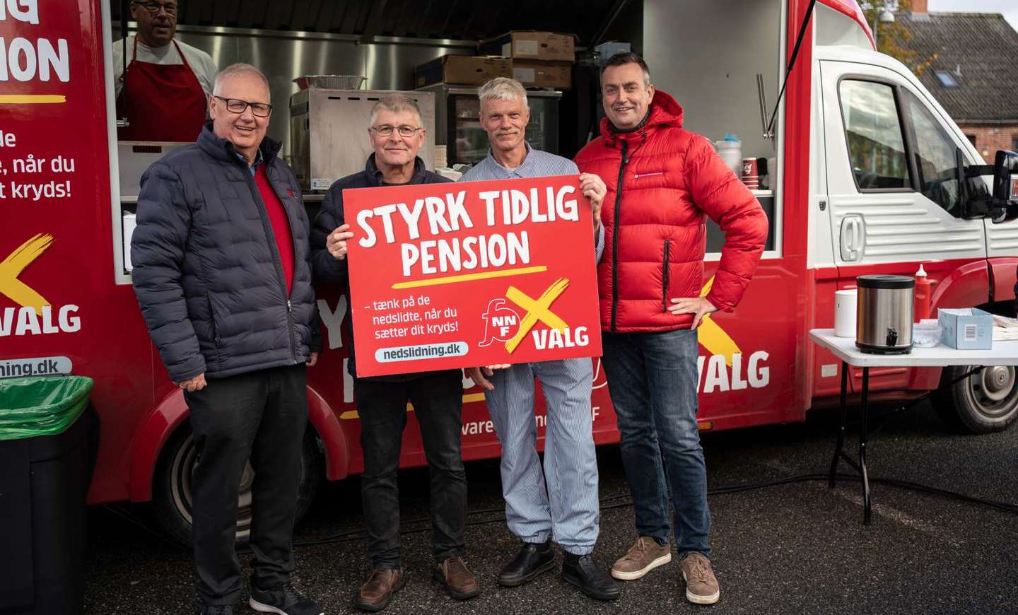 Anledningen er, at Fødevareforbundet NNF Østjylland turnerer i det østjyske i anledning af valgkampen for at snakke tidlig pension med vælgerne. Med på turen er bl.a. afdelingsformand Flemming Hansen.